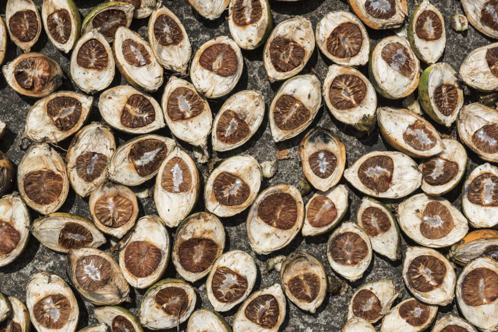 The main psychoactive ingredient in Betel Nut is called arecoline. Arecoline is a highly addictive stimulant that greatly enhances energy and mood, similar to caffeine or nicotine. It is most often chewed, either alone or cut with tobacco and slaked lime powder, in what is called a betel “quid.” Betel nut chewing causes overproduction of blood-red saliva, and prolonged use causes teeth and gums to turn red and eventually black. The presence of arecoline within betel nut makes chewing highly addictive, and combining the nut with slaked lime powder creates microscopic cuts in the gums to accelerate its stimulating effects.
